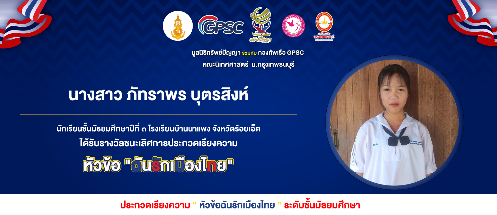 นางสาวภัทราพร  บุตรสิงห์ ชั้นมัธยมศึกษาปีที่ 3 โรงเรียนบ้านนาแพง จังหวัดร้อยเอ็ด
